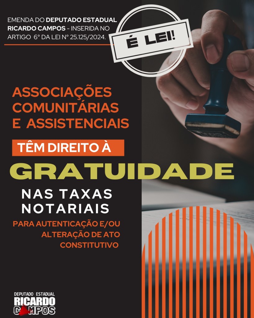Proposta do deputado estadual Ricardo Campos, transformada no artigo 6º da Lei 25.125/2024, trará alívio financeiro para as associações comunitárias, assistenciais, dentre outras.