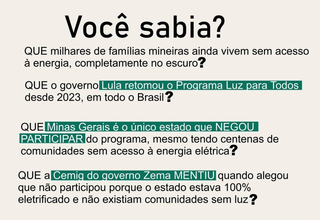 Ao longo de 2024, trabalhamos incansavelmente para garantir a retomada do Programa Luz para Todos em Minas Gerais, que foi o único estado que negou o benefício, alegando que 100% das comunidades rurais estavam eletrificadas; uma mentira.